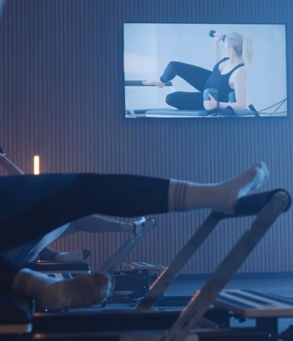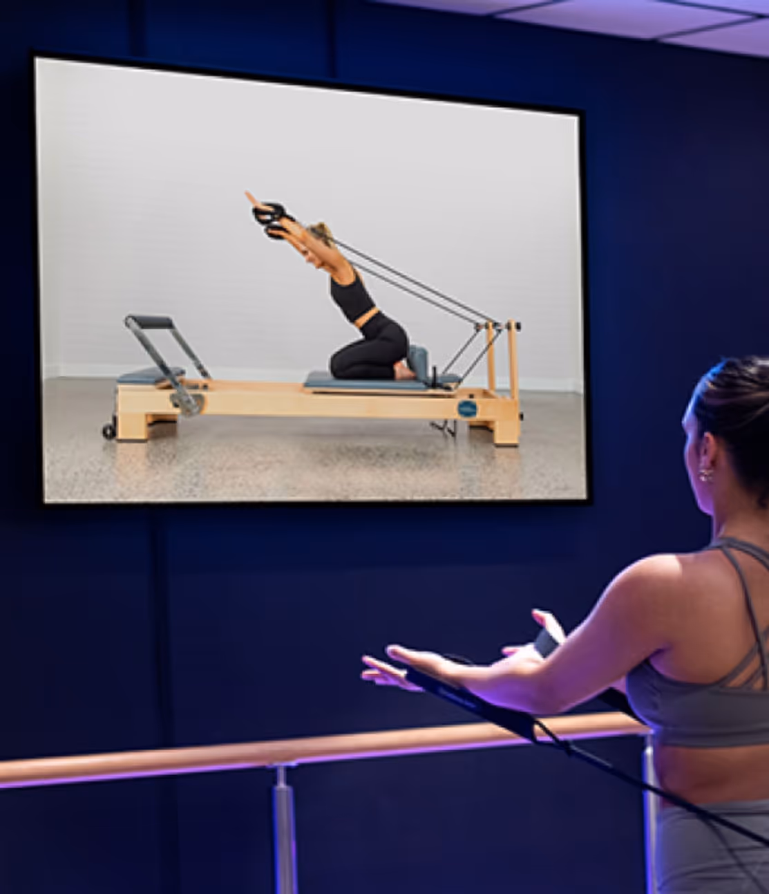 Virtuele groepslessen zijn complete Reformer lessen die je in onze studio volgt via een 100” scherm. Je traint in een vaste lesstructuur met duidelijke cues, timing en opbouw — zodat je zelfstandig kunt meedoen, maar wél met de helderheid en flow van een echte groepsles.